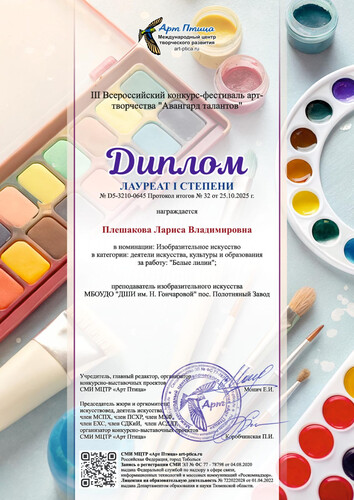 25 октября 2025 г. Международным центром творческого развития г. Тюмени «АРТ Птица» были подведены итоги III Всероссийского конкурса-фестиваля арт – творчества «Авангард талантов» в котором приняла участие преподаватель Плешакова Лариса Владимировна, представив свою конкурсную работу в номинации «изобразительное искусство» - «Белые лилии». Поздравляем с высокой наградой! |